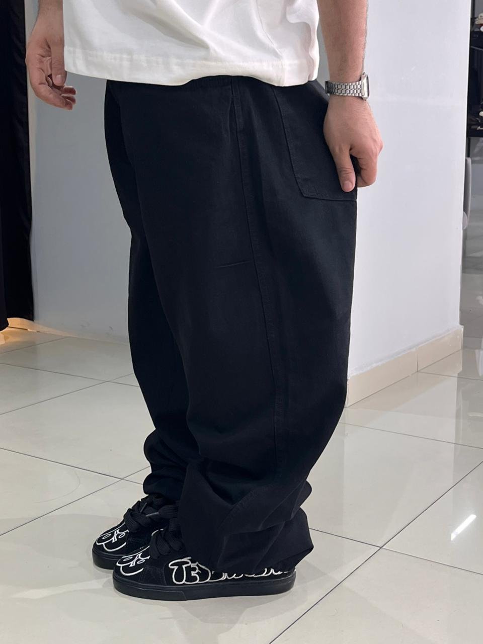 Pensada para versatilidade, essa calça se adapta a diversas composições, combinando perfeitamente com peças casuais e sobreposições. Seu design oversized oferece liberdade de movimento, enquanto o cós estruturado assegura um ajuste firme e estiloso. Uma escolha indispensável para quem valoriza atitude e originalidade no look.