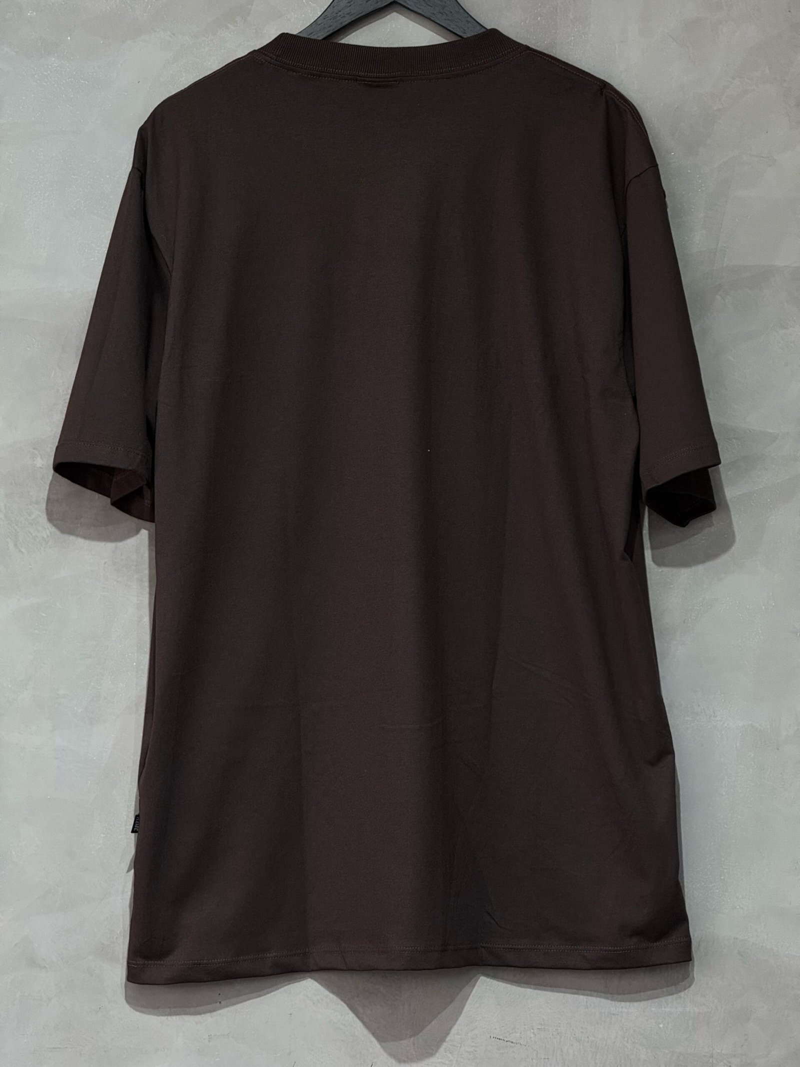 A camiseta possui modelagem oversized, proporcionando um ajuste confortável e descontraído. Seu design mais amplo oferece um caimento solto e fluído, com ênfase na amplitude nos ombros e no tórax. A gola de 2 cm em ribana canelada confere um toque estiloso.
